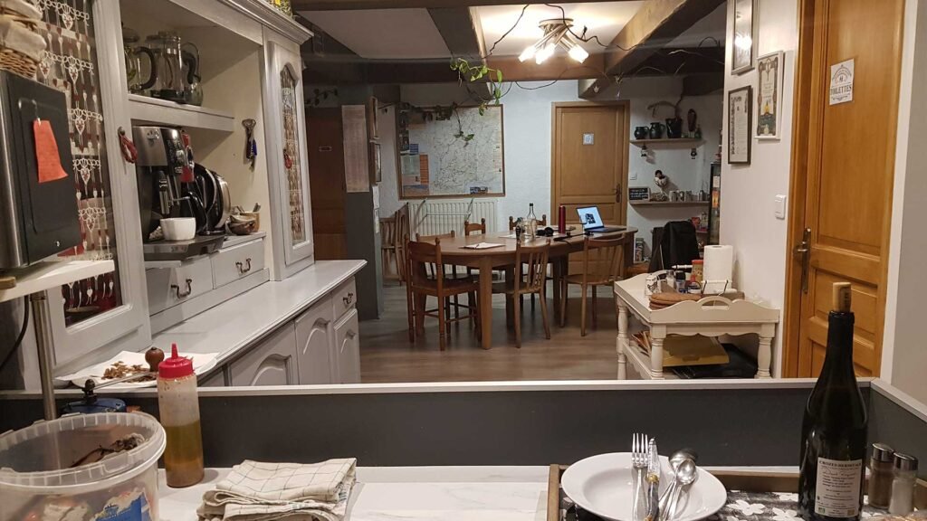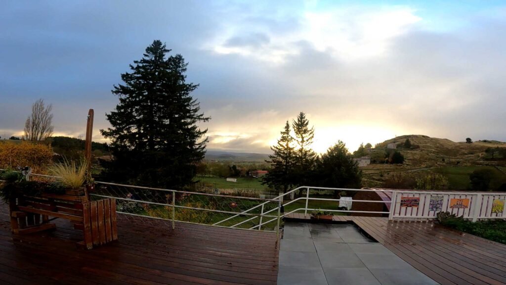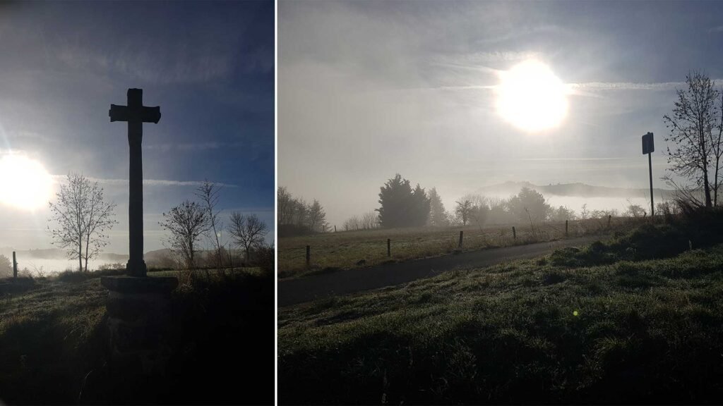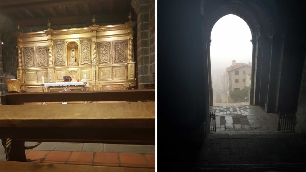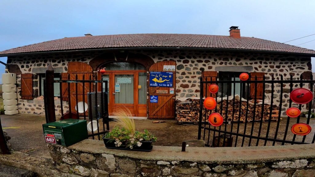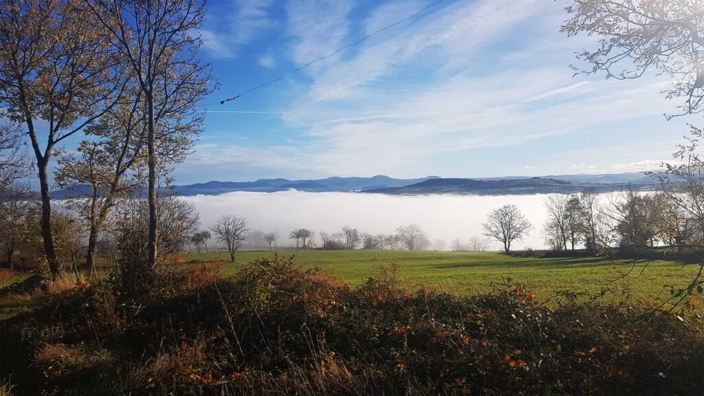 Après une bonne nuit et un petit déjeuner à 6h du matin au Grand Séminaire, je me dirige vers la cathédrale. Il est 7h10. La messe se déroule dans la petite chapelle. C’est sublime. Je suis le seul pèlerin. Pour la bénédiction je suis avec le prêtre. L’avantage d’être seul c’est que l’échange est plus intime. Je sors de la cathédrale par le grand escalier. Beaucoup de brouillard à l’extérieur. Il fait 6°, ça va, il ne fait pas trop froid. Je vais traverser la ville, puis prendre un chemin qui va me faire rejoindre le GR65. C’est une belle montée. Arrivé en haut il a du soleil et la brume a disparu. Incroyable et là je me retourne. Ouah la vue est magnifique. Le Puy en Velay a disparu sous un tapis de coton. Je pars vers Montbonnet, là où se trouve le gite d’Anne et  de Didier, le Gîte de la première étape. Un super gite avec une vue magnifique et des hôtes charmants. Je vous montrerai çà demain. Entre le Puy et Montbonnet le chemin est sec, large, et bien indiqué. En chemin j’ai la malchance de tomber sur un personnage bien connu du Camino, Alain.